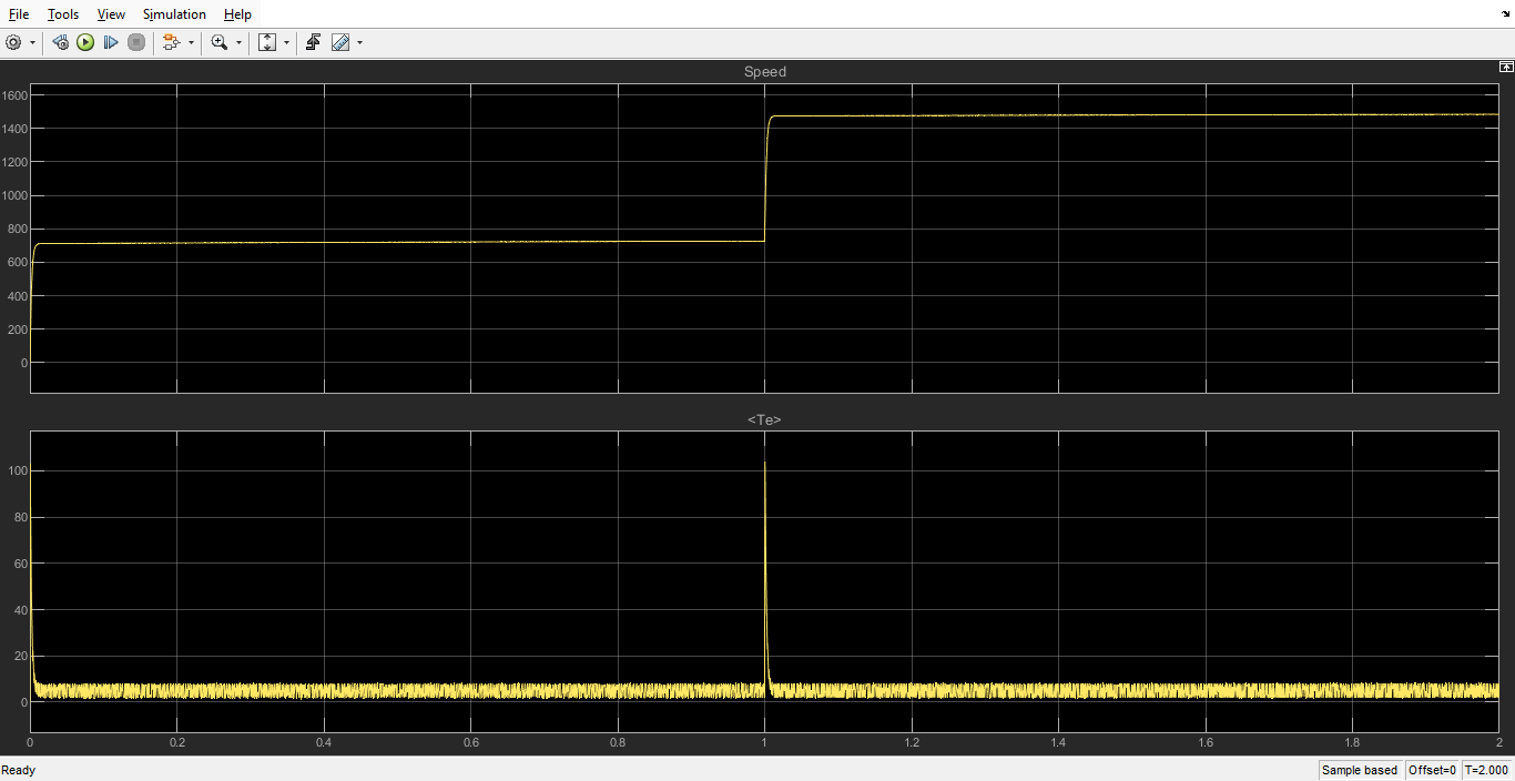 In this simulation, the three-phase currents of the Permanent Magnet Synchronous Motor (PMSM) are controlled using a Hysteresis Controller. Initially, the motor speed is sensed and compared with a reference speed. The reference speed is then adjusted from 750 RPM to 1500 RPM.